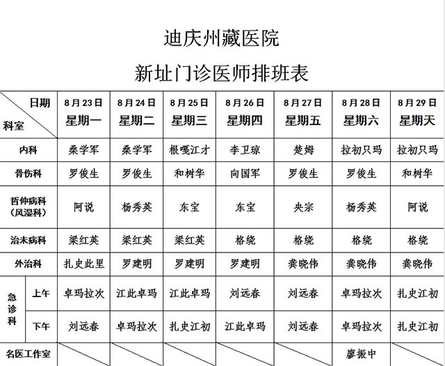 迪庆州藏医院2021年8月23日至8月29日新老址门诊坐诊专家排班表